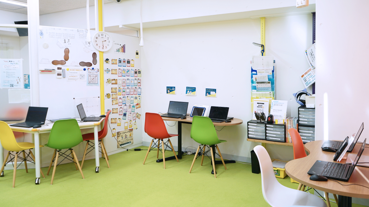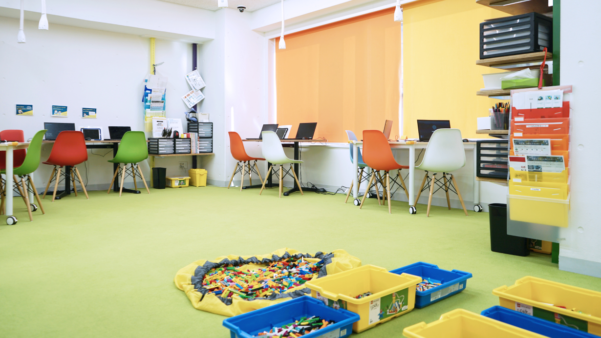 教室内は窓が大きく明るいオープンな空間となっており、カラフルな室内には様々なガジェットや書籍などをご用意しています。教室では子ども同士でのコミュニケーションも生まれるようなオープンな雰囲気づくりに努めています。